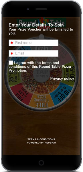 PepsiCo joined forces with mobile marketing platform Coupontools in November 2016 for mobile coupon activation via gamification. The campaign was created for PepsiCo's retail partner Round Table Pizza, specifically in a close radius of participating franchises.