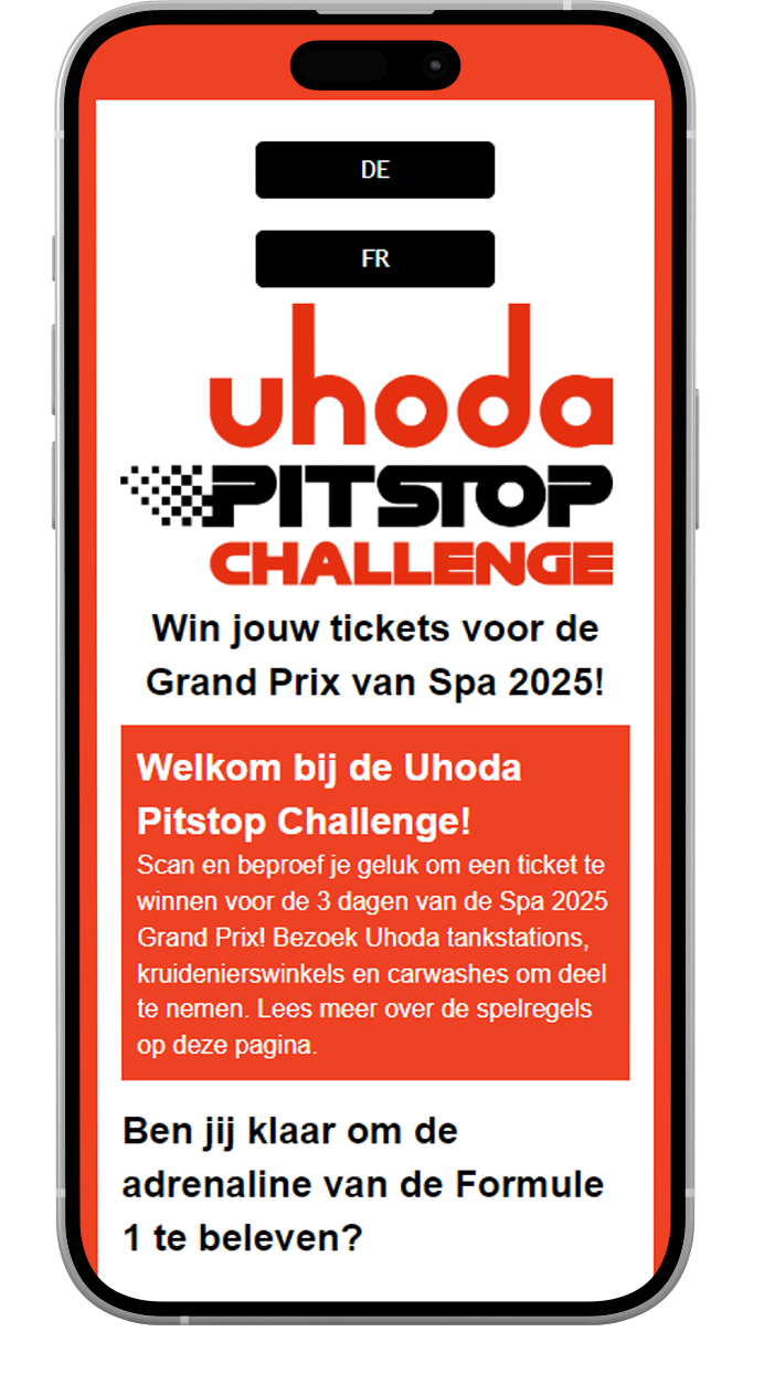 Juntos, aceleramos com o Uhoda Pitstop Challenge – uma campanha interativa com QR codes lançada em toda a Bélgica, em português, francês e neerlandês. O objetivo? Transformar postos, lavagens de carro e lojas em pontos de diversão e recompensas.