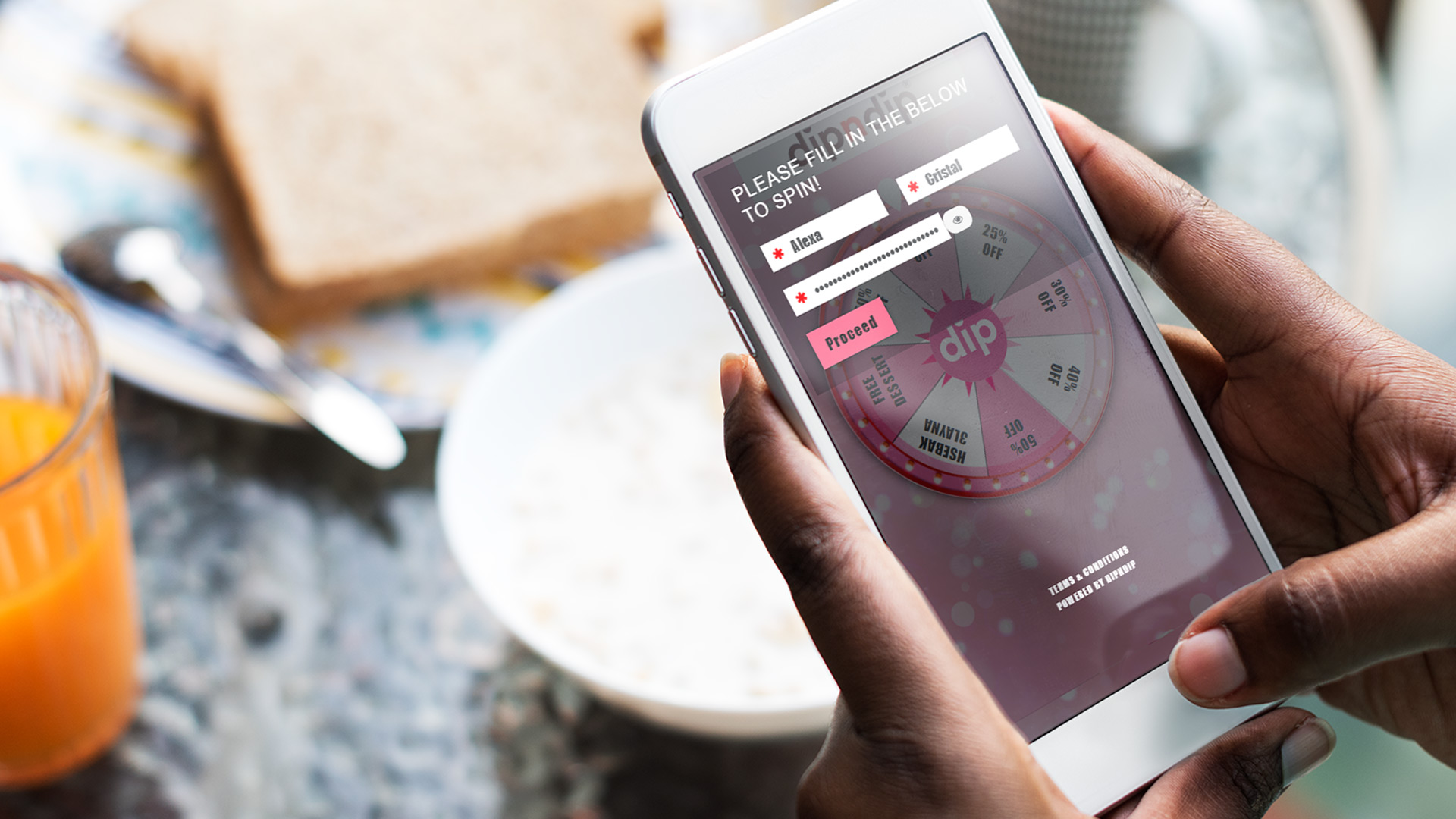 Un camarero proporcionaba el concurso de rueda giratoria digital en una tableta en cada mesa. Los clientes tenían que introducir su dirección de correo electrónico personal si querían intentarlo y ganar algún premio en la rueda. Los premios de la rueda eran descuentos para compras posteriores en cualquier café de chocolate DipnDip.
