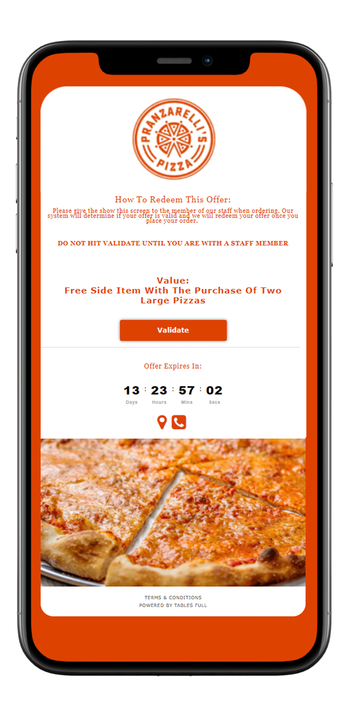 Usando nuestro widget de validación interna con una contraseña de localización única, Tablesfull garantizó campañas a prueba de fraude. Debido a que la pizzería tenía múltiples ubicaciones, cada ubicación de canje tenía su contraseña de validación única. De esta manera, era fácil rastrear qué cupón fue validado en qué restaurante.