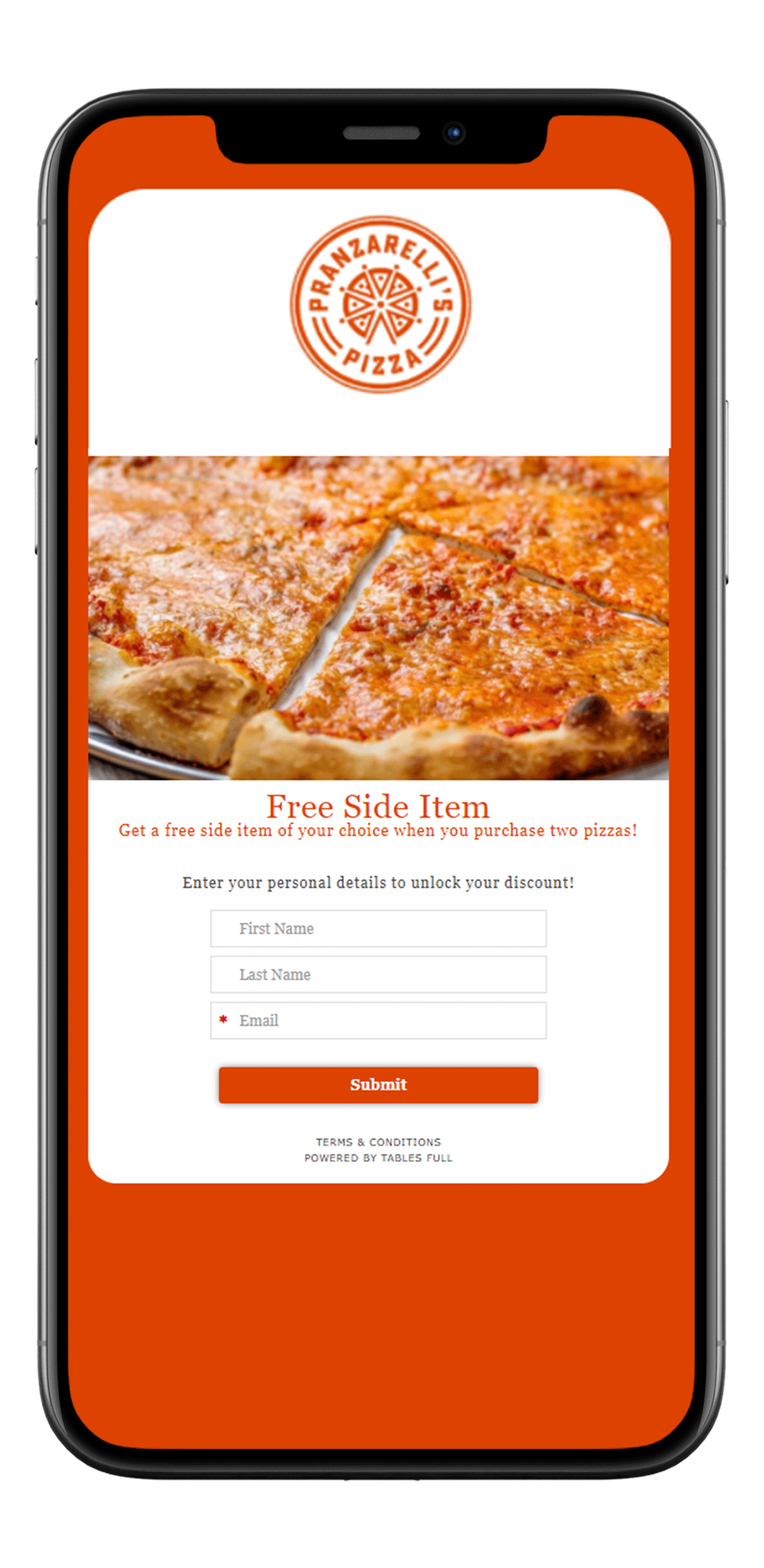 Tablesfull usó Coupontools para crear cupones digitales para la pizzería. Crearon múltiples tipos de cupones: cupones regulares, rasca & gana, y ruedas giratorias. Para el primer cupón, se centraron en la captura de datos. Antes de que el usuario del cupón pudiera canjearlo, tenía que introducir sus datos. De esta manera, la pizzería inició una base de datos de clientes adecuada. Les permitió llegar al mismo público directamente, un público que es probable que interactúe con sus promociones.
