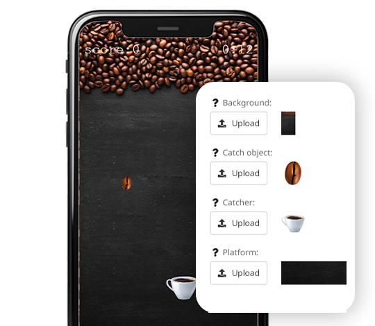 El juego Catch es un juego fácil y entretenido donde los usuarios atrapan objetos que caen en sus pantallas. Está diseñado para mantener a tu audiencia entretenida mientras aprenden sobre tu marca y ganan recompensas.