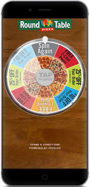 PepsiCo aumentó las ventas de Round Table Pizza con los cupones de juego. Recientemente, PepsiCo dió cupones móviles a la generación millenial de la mano de los minoristas participantes, como fue el restaurante de comida rápida Round Table Pizza, que los invitó a girar una rueda de premio digital para obtener un descuento.