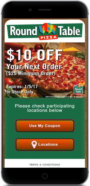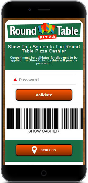5) El consumidor puede canjear el cupón en la tienda y Round Table Pizza puede validar el cupón utilizando nuestros sencillos métodos de validación.