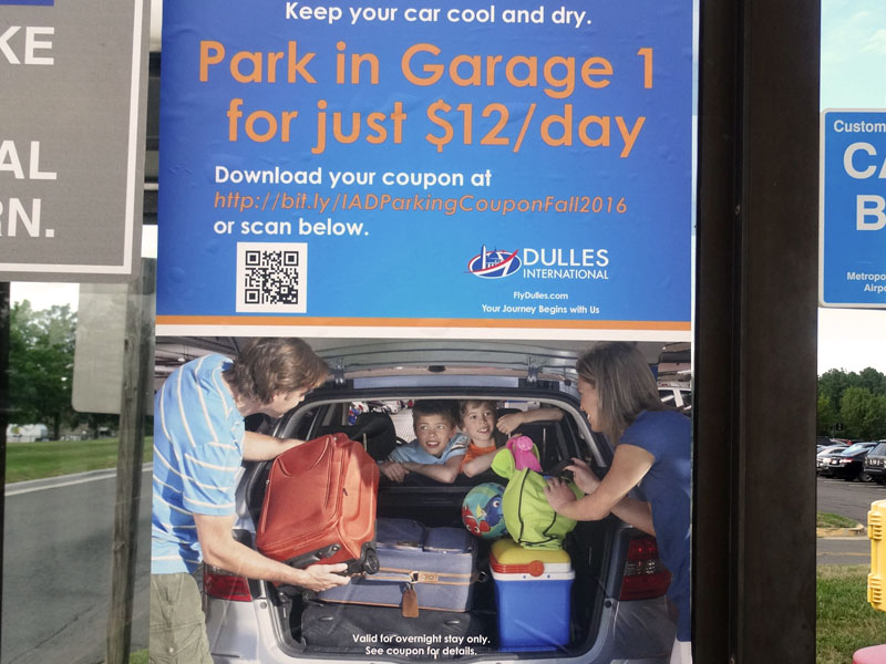 Dulles International est un aéroport international situé près de Washington, DC. Son service de stationnement utilise la plateforme Coupontools pour distribuer des coupons avec des codes QR et l’URL d’une page web. Les clients du parking peuvent trouver des coupons distribués sur des affiches proposant des améliorations du choix de stationnement à prix réduit.